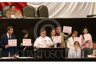 MEXICO, D.F., 31MARZO2005.- Durante la intervención del diputado priista Adrian Villagómez, muchos de sus compañeros mostraron carteles contra las alzas al gas y a la luz, durante la sesión en la Cámara de Diputados. FOTO: Moisés Pablo/CUARTOSCURO.COM