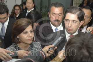 MÉXICO, D.F., 10JULIO2012.- Secretaria del Trabajo y Previsión Social, Rosalinda Vélez Juárez, y el Secretario de Comunicaciones y Transportes, Dionisio Pérez-Jácome Friscione, ofrecieron una rueda de prensa al término de la reunión que sostuvieron con el representante de los inversionistas del Grupo Med Atlántica, Christian Cadenas, para dialogar en torno a la situación actual de la Compañía Mexicana de Aviación. FOTO: CUARTOSCURO.COM