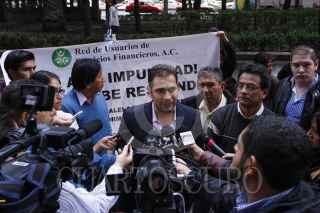 MÉXICO, D.F., 12JULIO2012.- Miembros de la Red de Usuarios de Servicios Financieros, encabezó una protesta frente al edificio donde se encuentran las oficinas de la empresa Monex, acusada de triangular fondos para beneficiar al PRI durante la elección presidencial. FOTO: ISAAC ESQUIVEL /CUARTOSCURO.COM