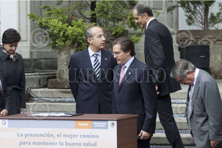 MÉXICO, D.F., 12JULIO2012.- Daniel Servitje, director general del grupo industrial Bimbo, saluda a Felipe Calderón Hinojosa, Presidente de México, tras la firma de convenio de concertación de acciones para la reducción de sal en la producción del pan, en la residencia oficial de Los Pinos. FOTO: MOISÉS PABLO /CUARTOSCURO.COM