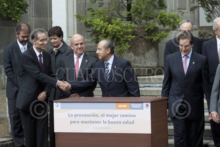 MÉXICO, D.F., 12JULIO2012.- Daniel Servitje, director general del grupo industrial Bimbo, saluda a Felipe Calderón Hinojosa, Presidente de México, tras la firma de convenio de concertación de acciones para la reducción de sal en la producción del pan, en la residencia oficial de Los Pinos. FOTO: MOISÉS PABLO /CUARTOSCURO.COM
