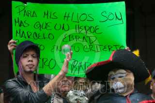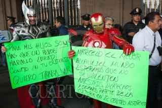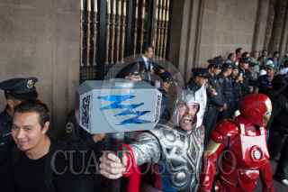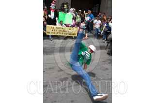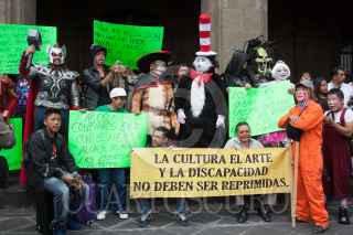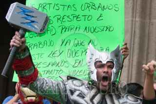 MÉXICO D.F., 13JULIO2012.- Artistas callejeros que trabajan en la calle de Madero se manifestaron por que las autoridades no los dejan realizar su actividad comercial, hasta el punto que han sido reprimidos por granaderos, cuando ellos solamente buscan divertir a la gente que transita por el centro histórico, apuntaron. Los inconformes protestaron afuera del Antiguo Palacio del Ayuntamiento en donde pretendían instalarse en plantón pero no se los permitió la policía. FOTO: MOISÉS PABLO /CUARTOSCURO.COM