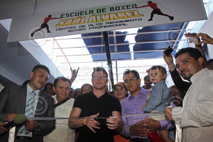 GUADALAJARA, JALISCO 13JULIO2012.- Este medio día Saul "Canelo" Alvarez, llego procedente de los Angeles C.A. solo para inaugurar el Gimnasio de su entrenador, Edison Reynoso, mismo que lleva el nombre del joven boxeador, en el evento también estuvo presente le manager José "Chepo" Reynoso y algunas personalidades del boxeo. FOTO: FERNANDO CARRANZA GARCÍA /CUARTOSCURO.COM