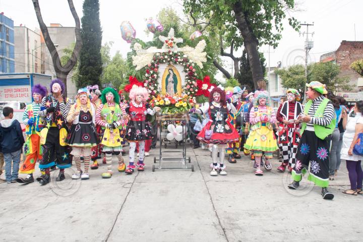 MÉXICO, D.F., 17JULIO2012.- Decenas de payasos realizaron hoy su peregrinación anual a la Basilica de Guadalupe. El recorrido de la alegría partió de la Glorieta de Peralvillo y culminó con una misa en La Villa de Guadalupe. Las Payasitas se encargaron de llevar una imagen de la Guadalupana la cual encabezó la peregrinación. FOTO: FRANCISCO RODRÍGUEZ /CUARTOSCURO.COM