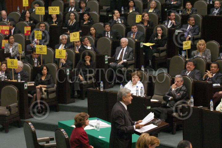 MEXICO, D.F., 07ABRIl2005.- Andrés Manuel López Obrador, jefe de gobierno, se presentó ante el pleno de la Cámara de Diputados que se erigió en Jurado de Procedencia, para decidir si se le retira el desafuero, en el caso de desacato a una orden judicial en el caso del predio del Encino. En la imagen, lo acompañan Pablo Gómez, coordinador de la bancada perredistas. FOTO: Moisés Pablo/CUARTOSCURO.COM
