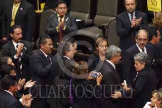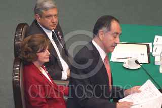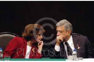 MEXICO, D.F., 07ABRIl2005.- Andrés Manuel López Obrador, jefe de gobierno, se presentó ante el pleno de la Cámara de Diputados que se erigió en Jurado de Procedencia, para decidir si se le retira el desafuero, en el caso de desacato a una orden judicial en el caso del predio del Encino. En la imagen el jefe de gobierno conversa con Teresa Juárez, su representante legal. FOTO: Germán Romero/CUARTOSCURO.COM
