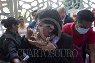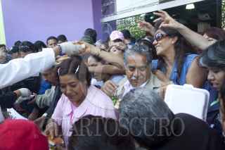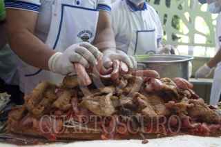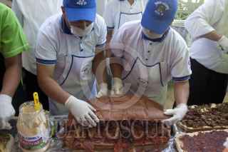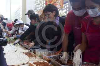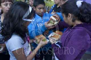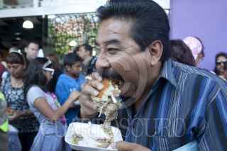 MÉXICO, D.F., 24JULIO2012.- Personas disfrutan de una pedazo de la megatorta de 7 metros que se realizó en el marco del anunció de la 9a Feria de la Torta a inaugurarse el 1 de agosto en la explanada de la delegación Venustiano Carranza. FOTO: MOISÉS PABLO /CUARTOSCURO.COM