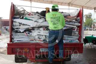 MÉXICO, D.F. 25JULIO2012.- LA Secretaría de Desarrollo Urbano y Vivienda del (SEDUVI), encabezada por Felipe Leal, entregó material reciclable obtenido de propaganda electoral y anuncios publicitarios a la empresa Arpema Plastic Recycle. FOTO: JUAN PABLO ZAMORA /CUARTOSCURO.COM