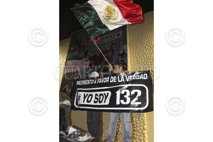 MÉXICO D.F., 26JULIO2012.- Integrantes del movimiento "Yo Soy 132", SME y organizaciones sociales, se manifestaron frente a las instalaciones de Televisa Chapultepec, donde realizaron una toma simbólica de la televisora. Personal de la SSP-DF resguardaron las instalaciones para evitar agresiones a los edificios de Televisa. FOTO: SAÚL LÓPEZ /CUARTOSCURO.COM