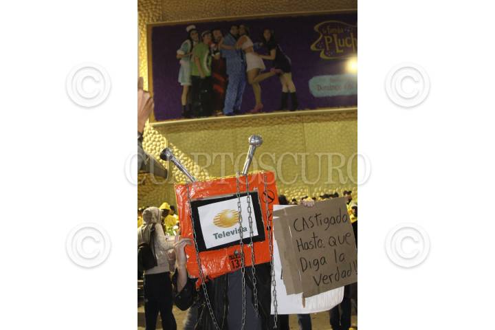 MÉXICO D.F., 26JULIO2012.- Integrantes del movimiento "Yo Soy 132", SME y organizaciones sociales, se manifestaron frente a las instalaciones de Televisa Chapultepec, donde realizaron una toma simbólica de la televisora. Personal de la SSP-DF resguardaron las instalaciones para evitar agresiones a los edificios de Televisa. FOTO: SAÚL LÓPEZ /CUARTOSCURO.COM