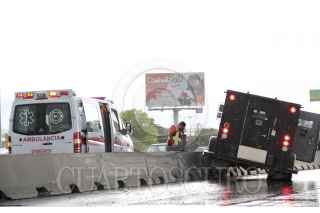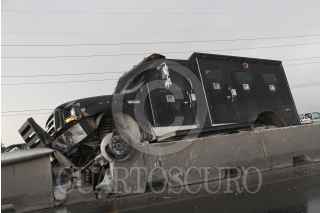 SALTILLO, COAHUILA, 27JULIO2012.- Debido a las fuertes lluvias y el pavimento mojado la tarde de ayer se registró un choque provocando una carambola en la que participaron elementos policíacos del Grupo de Armas Tácticas Especiales GATE del estado de Coahuila, quienes circulaban de oriente a poniente de la ciudad; el percance no dejó personas lesionadas. FOTO: KARLA ITZEL RUIZ /CUARTOSCURO.COM