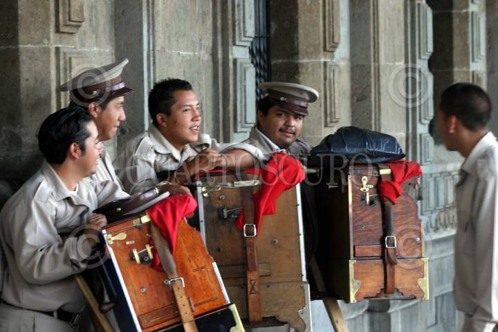 MEXICO, D.F., 08ABRIL2005.- Organilleros se toman un descanso en los portales del Palacio del Ayuntamiento. FOTO: Moisés Pablo/CUARTOSCURO.COM