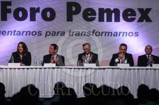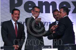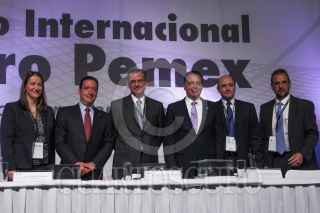 MÉXICO, D.F., 01AGOSTO2012.- Cybele Díaz Wionczek, Subdirectora de la Unidad de Desarrollo de Proveedores, Contratistas y Contenido Nacional de PEMEX junto a Francisco Funtanet, Presidente de la CONCAMIN; Juan José Suárez Coppel, Director General de Petróleos Mexicanos (PEMEX); Bruno Ferrari, Secretario de Economia y Carlos R. Murrieta Cummings, Director Coorporativo de Operaciones de PEMEX durante el primer foro internacional ExpoForo Pemex que tuvo lugar en el Centro Banamex. FOTO: ENRIQUE ORDÓÑEZ /CUARTOSCURO.COM