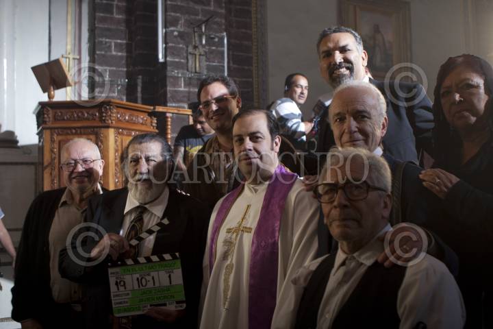 MÉXICO, D.F. 01AGOSTO2012.- Los actores, Eduardo Manzano, Pedro Weber "Chatanuga", Luis Ortíz, Jose Carlos Ruíz y Luis Bayardo en primer plano son los protagonistas de la cinta "En el último Trago" cinta de Jack Zagha (atras de Chatanoga) la cual tuvo como locación la iglesia de Santa Teresa ubicada en la Plaza de de Loreto. FOTO: FRANCISCO RODRÍGUEZ /CUARTOSCURO.COM