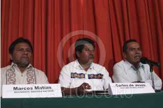 MÉXICO D.F., 02AGOSTO2012.- Marcos Matías del movimiento indígena junto a Carlos de Jesús, Diputado Federal electo y Abundio Marcos, integrante del movimiento indígena durante la conferencia donde hablaron sobre la discriminación que han sufrido las comunidades indígenas principalmente por los ex candidatos a la presidencia de la república y políticos en general. FOTO: ENRIQUE ORDÓÑEZ /CUARTOSCURO.COM