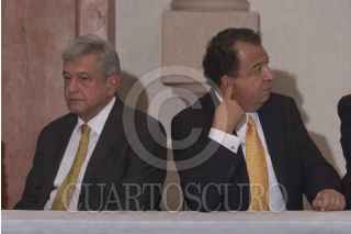 MÉXICO, D.F., 02AGOSTO2012.-Andrés Manuel López Obrador, acompañado de Ricardo Monreal, y los presidentes de los partidos PRD y Movimiento Ciudadano, Jesús Zambrano y Luis Walton, ofrecieron una conferencia de prensa donde dieron a conocer las triangulaciones que presuntamente realizó el PRI a través de la cuentas de Luis Videgaray en ScotiaBank y Bancomer, con las que transferian a otras cuentas de manera inmediata. FOTO: JUAN PABLO ZAMORA /CUARTOSCURO.COM