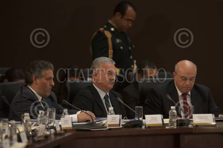 MÉXICO D.F., 02AGOSTO2012.- José Antonio Meade Kuribreña, secretario de Hacienda y Crédito Público, Genaro García Luna, secretario de la Seguridad Pública Federal, y Guillermo Galván Galván, secretario de la Defensa, durante la XXXIII Sesión del Consejo Nacional de Seguridad Pública en el Palacio Nacional. FOTO: MOISÉS PABLO /CUARTOSCURO.COM