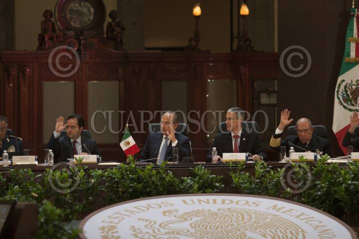 MÉXICO D.F., 02AGOSTO2012.- José Antonio Meade Kuribreña, secretario de Hacienda y Crédito Público, Genaro García Luna, secretario de la Seguridad Pública Federal, y Guillermo Galván Galván, secretario de la Defensa, durante la XXXIII Sesión del Consejo Nacional de Seguridad Pública en el Palacio Nacional. FOTO: MOISÉS PABLO /CUARTOSCURO.COM
