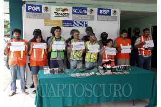 VILLAHERMOSA, TABASCO, 07AGOSTO2012.- Elementos del ejército presentaron, en las instalaciones de la Policía Ministerial, una presunta banda de plagiarios y asaltantes conformada por seis hombres y dos mujeres y que según las autoridades operaban en Chiapas y Tabasco. Les decomisaron vehículos, armas, teléfonos celulares y dinero en efectivo. FOTO: MARCO POLO GUZMÁN HERNÁNDEZ/CUARTOSCURO.COM