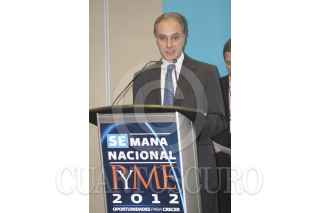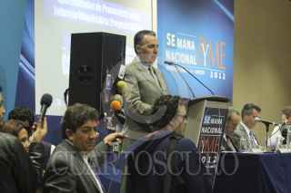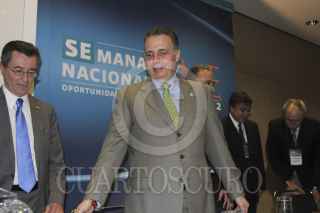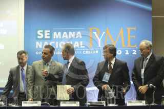 MÉXICO, D.F., 08AGOSTO2012.- Santiago Gutiérrez Fernández, presidente nacional de la Canieti, Bruno Ferrari, Secretario de Economía, acompañado de Miguel Marón Manzur, subsecretario PYME, Guillermo Fernández de la Garza, presidente Ejecutivo de la FUMEC, durante la presentación del catálogo de proveedores de la industria de la maquiladora, durante la semana nacional PYME. FOTO: SAUL LÓPEZ /CUARTOSCURO.COM