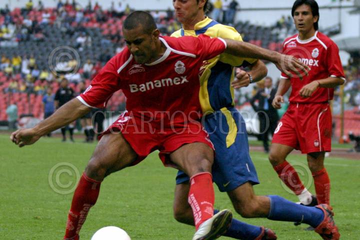 MEXICO, D.F. 17ABRIL2005.- Paulo Cesar Da Silva, de los diablos rojos del Toluca, le quita el balón a Claudio Javier López de las águilas del América, en su encuentro en el Estadio Azteca. Foto: Sandra Perdomo/CUARTOSCURO.COM