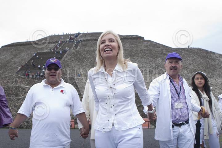 SAN JUAN TEOTIHUACAN, ESTADO DE MEXICO., 11AGOSTO2012.- La producción de Carla Estrada, "Los Doctores" acudió a la zona arqueuológica de Teotihuacán para realizar una ceremonia de carga de energía y buenas vibras, con el fin de que esta nueva producción que esta basado en un "Reality Show" donde Médicos especialistas atenderán las inquietudes del público en general. Durante la ceremonia fue acompañada por el actro Fernando Carrillo y su esposo Oscar del Toro. FOTO: FRANCISCO RODRÍGUEZ / CUARTOSCURO.COM