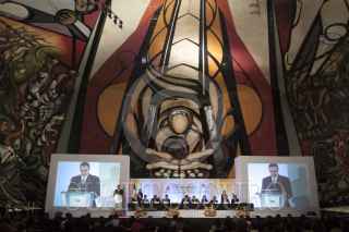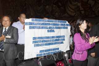 MÉXICO, D.F., 14AGOSTO2012.- Defraudados de la cooperativa "Federación Centro Sur de Morelos" se manifestaron por que no les han devuelto su dinero, mostrando una pancarta durante el encuentro "Las Cooperativas un modelo de desarrollo con carácter Social", que se realizó en el Polyforum Siqueiros. FOTO: MOISÉS PABLO /CUARTOSCURO.COM