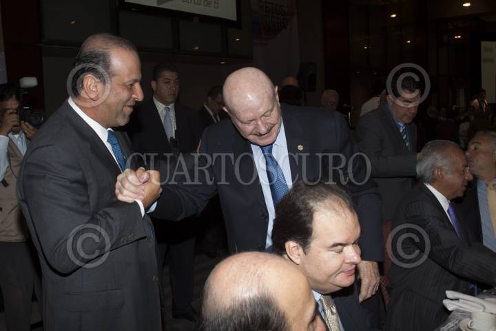MÉXICO, D.F., 15AGOSTO2012.- La Coparmex le entregó un reconocimiento a Manuel Mondragón y Kalb, Secretario de Seguridad Pública del DF, al finalizar su informe de labores al frente de esta de dependencia. La placa le fue entregada por Fernando Oscar García Chávez, presidente de la Confederación Patronal de la República Mexicana Ciudad de México. FOTO: MOISÉS PABLO /CUARTOSCURO.COM