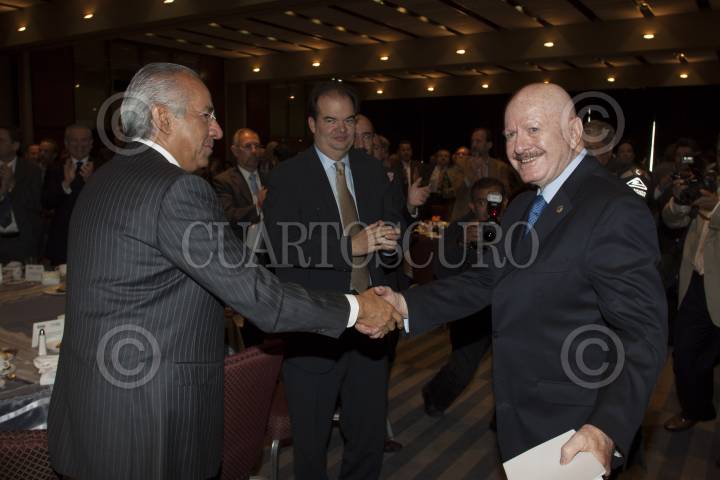 MÉXICO, D.F., 15AGOSTO2012.- La Coparmex le entregó un reconocimiento a Manuel Mondragón y Kalb, Secretario de Seguridad Pública del DF, al finalizar su informe de labores al frente de esta de dependencia. La placa le fue entregada por Fernando Oscar García Chávez, presidente de la Confederación Patronal de la República Mexicana Ciudad de México. FOTO: MOISÉS PABLO /CUARTOSCURO.COM