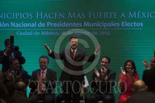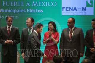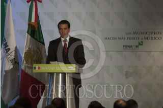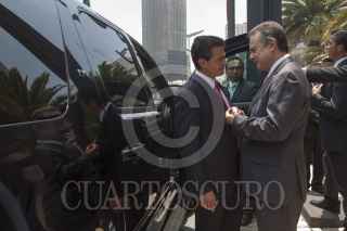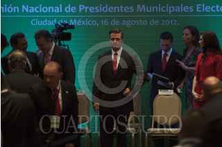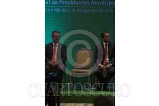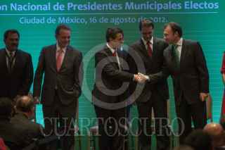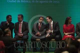 MÉXICO, D.F., 16AGOSTO2012.- Enrique Peña Nieto, candidato ganador de la elección Presidencial, conversa con Pedro Joaquín Coldwell, presidente nacional del PRI, al finalizar el evento "Los Municipios hacen más fuerte a México" organizado por la Federación Nacional de Municipios de México A.C., en el hotel Melía de Reforma. FOTO: MOISÉS PABLO /CUARTOSCURO.COM