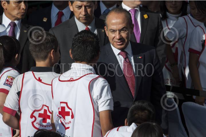 MÉXICO, D.F., 16AGOSTO2012.- El presidente Felipe Calderón acompañado del piloto mexicano Sergio "Checo" Perez; durante el lanzamiento de la campaña Pilotos por la Seguridad Vial que se realizó en el Autódromo Hermanos Rodríguez. FOTO: RODOLFO ANGULO /CUARTOSCURO.COM