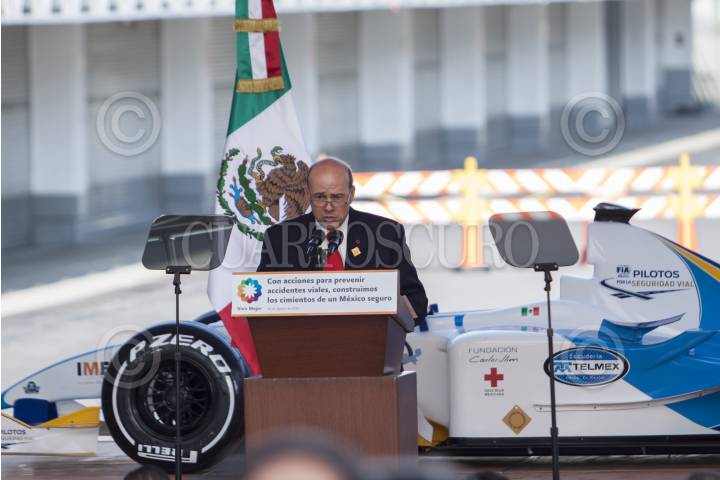 MÉXICO, D.F., 16AGOSTO2012.- El presidente Felipe Calderón acompañado del piloto mexicano Sergio "Checo" Perez; durante el lanzamiento de la campaña Pilotos por la Seguridad Vial que se realizó en el Autódromo Hermanos Rodríguez. FOTO: RODOLFO ANGULO /CUARTOSCURO.COM