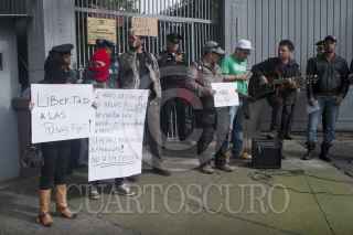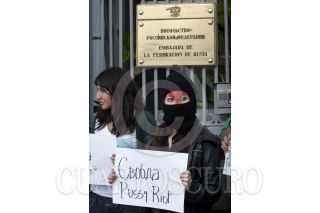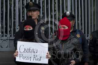 MÉXICO, D.F., 17AGOSTO2012.- Un grupo de jóvenes protestaron a las afueras de la Embajada de Rusia en contra de la condena de 3 integrantes del grupo ruso de punk Pussy Riot, las cuales fueron condenadas a purgar una pena de 2 años en prisión por cantar en una catedral ortodoxa contra el presidente del país Vladímir Putin. FOTO: FRANCISCO RODRIGUEZ /CUARTOSCURO.COM