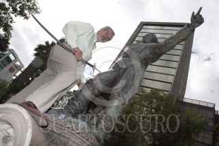 MÉXICO, D.F., 17AGOSTO2012.- El escultor Juan Carlos Canfield restaura el monumento del general republicano, de orígen tamaulipeco, Pedro José Méndez, en el paseo de la Reforma. El gobierno del Estado de Tamaulipas es el encargado de la restauración. FOTO: JUAN PABLO ZAMORA /CUARTOSCURO.COM