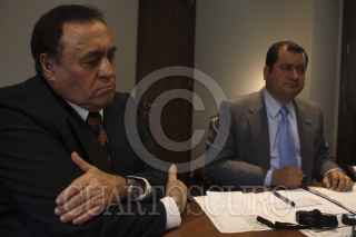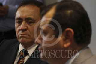 OAXACA, OAXACA 17AGOSTO2012.- Jesús Martínez Álvarez, secretario General de Gobierno (Segego), y Obdulio Ávila Mayo, subsecretario de Gobernación (Segob) durante la conferencia de prensa para tratar el conflicto limítrofe entre Oaxaca y Chiapas, por la región de los Chimalapas. Ávila Mayo aseguró que el problema esta siendo atendido, pero que este no será resuleto en tanto no exista un acuerdo conciliatorio. FOTO: JORGE ARTURO PÉREZ ALFONSO /CUARTOSCURO.COM