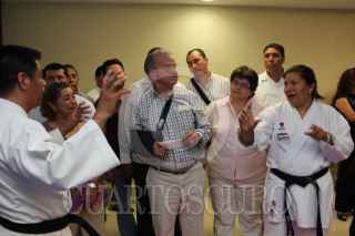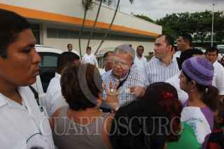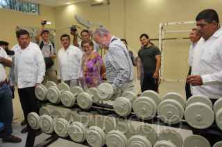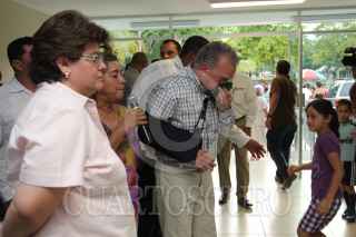 VILLAHERMOSA, TABASCO, 17AGOSTO2012.- Andrés Granier Melo, gobernador local acudió a la reinauguración del Palacio de los Deportes, el tabasqueño apareció con el brazo derecho lesionado; después de haberse caído cuando tratada de levantar a unos de sus nietos y se rompió una membrana del codo, según lo explico. El mandatario al realizar un recorrido por distintas áreas de la ciudad deportiva recibió reproches de la comunidad deportiva "choca" por tenerlos en abandono tanto años. FOTO: MARCO POLO GUZMÁN HERNÁNDEZ /CUARTOSCURO.COM