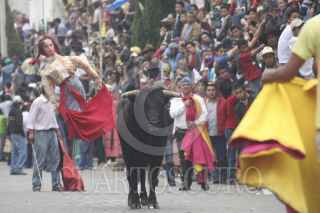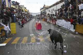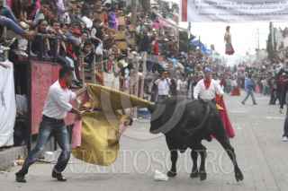 HUAMANTLA, TLAXCALA, 18AGOSTO2012.- Ejemplares de mas de de 400 kilogramos de peso recorrieron las calles de esta ciudad durante la tradicional fiesta conocida como la "huamantlada", en donde jovenes con aspiraciones de novilleros enfrentaron a los astados. En esta que fue la edicion numero 59 de la fiesta, resultaron 14 personas lesionadas, una de ellas con fractura de craneo y otra con desprendimiento de escroto. FOTO: J.GUADALUPE PÉREZ /CUARTOSCURO.COM