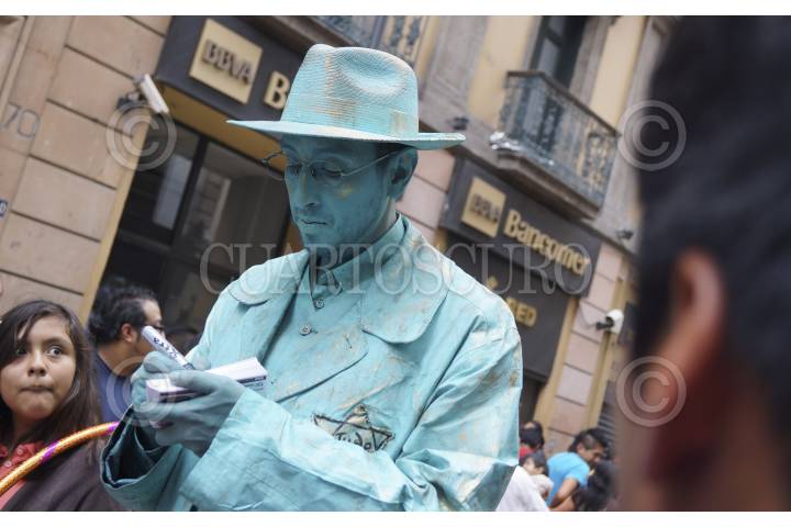 MÉXICO D.F., 20AGOSTO2012.- Un artista urbano, dedicado al performance conocido como "Estatua Humana", es observado por los peatones sobre la calle Madero en el centro ciudad. El artista, quien escribe en Hebreo el nombre de los curiosos, protesta por medio de pancartas en contra del "estado que criminaliza el arte urbano" y "a favor de arte libre en las calles". FOTO: PEDRO ANZA /CUARTOSCURO.COM