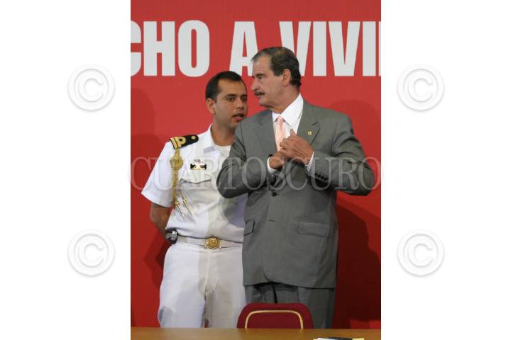 MEXICO, D.F. 20ABRIL2005.- El presidente Vicente Fox, habla con miembro del Estado Mayor, antes de retirarse del salón Adolfo López Mateos, al término de la sesion de la Asamblea General del INFONAVIT. FOTO: Sandra Perdomo/CUARTOSCURO.COM