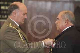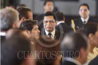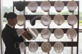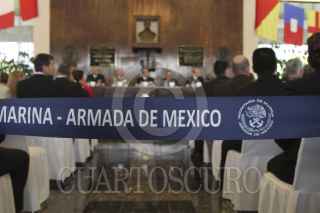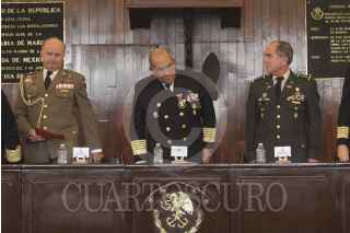 MÉXICO, D.F. 22AGOSTO2012.- Una militar acomoda los tocados de los almirantes que acudieron a al condecoración de Mariano Francisco Saynez Mendoza, Secretario de Marina Armada de México, con la medalla de la Asociación de Agregados Militares Navales Aéreos en grado maximo distinguido que otorga dicha asociación. FOTO: SAÚL LÓPEZ /CUARTOSCURO.COM