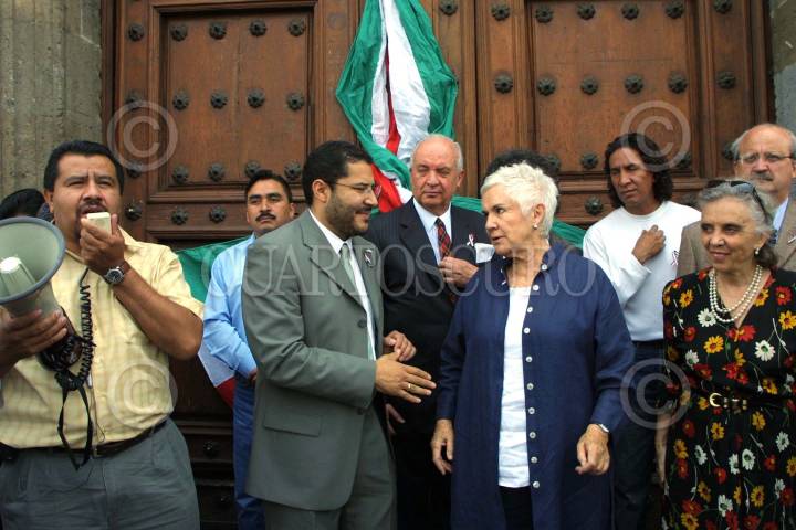 MEXICO D.F 20 ABRIL 2005.- Intelectuales y perredistas se manifestaron en Palacio Nacional en contra del desafuero que le fue impuesto a Andres Manuel López Obrador. FOTO: Eunice Adorno_CUARTOSCURO.COM