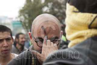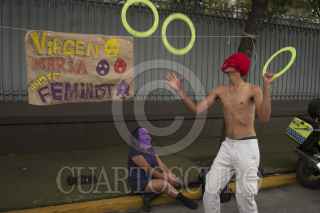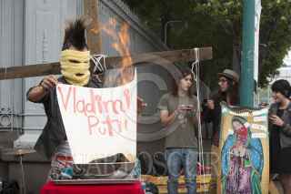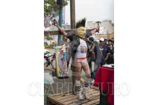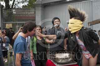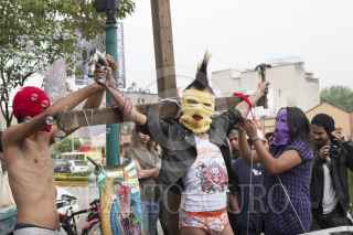 MÉXICO, D.F., 24AGOSTO2012.- El vocalista de "Patitos Punk" Orgy punk simuló una misa, se crucificó y quemó carteles con los nombre de Nicolas Zarkosy, presidente de Francia, Vladimir Putin presidente de Rusia y Enrique Peña Nieto candidato del PRi a la presidencia de la república en la reciente elección presidencial. FOTO: FRANCISCO RODRÍGUEZ /CUARTOSCURO.COM