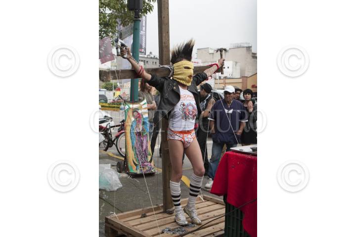 MÉXICO, D.F., 24AGOSTO2012.- El vocalista de "Patitos Punk" Orgy punk simuló una misa, se crucificó y quemó carteles con los nombre de Nicolas Zarkosy, presidente de Francia, Vladimir Putin presidente de Rusia y Enrique Peña Nieto candidato del PRi a la presidencia de la república en la reciente elección presidencial. FOTO: FRANCISCO RODRÍGUEZ /CUARTOSCURO.COM
