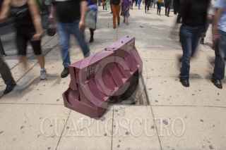 MÉXICO, D.F., 25AGOSTO2012.- Un registro se observa peligrosamente destapado en la Avenida Peatonal Madero. Autoridades del Gobierno del DF improvisaron una "tapa" para este problema. FOTO: JUAN PABLO ZAMORA /CUARTOSCURO.COM