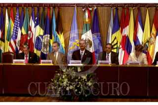 MEXICO, D.F. 21ABRIL2005.- Luis Ernesto Derbez, Secretario de Relaciones Exteriores, Vicente Fox Quesada, presidente de México, Javier Usabiaga, Secretario de Agricultura, Ganadería, Desarrollo Rural, Pesca y Aimentación (SAGARPA) y Mirta Roses Periago, directora de la organización Panamericana de la Salud en la ceremonia de inauguración de la XIV reunión interamericana a nivel ministerial en Salud y Agricultura. FOTO:/CUARTOSCURO.COM