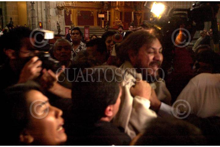 El lider de los deudores del banca Gerardo Fernandez Noroña acudio a la Catedral Metropolitana a entregar una carta a Norberto Rivera, donde informa que dos días antes de la visita de Juan Pablo II realizará una huelga de hambre, fue detenido por elementos de seguridad. FOTO: Juan Pablo Zamora/CUARTOSCURO.