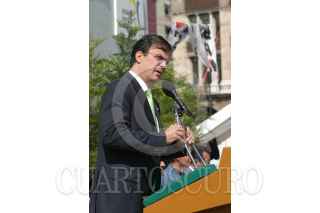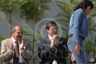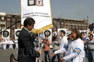 MEXICO, D.F. 27ABRIL2005.- El secretario de Desarrollo Social del DF, Marcelo Ebrard, ntregó el estandarte del Gobierno del Distrito Federal 2005 a los jovenes deportistas, previo a sus próximas competencias. Evento realizado en el zócalo capitalino. FOTO: Sandra Perdomo/CUARTOSCURO.COM