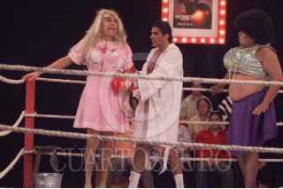 MEXICO, D.F. 27ABRIL2005.- En su papel de Celostina, Adrián Uribe luchará en un ring con Jorge Kawaghi, en la emisión del programa de Televisa La hora pico, producción de Reynaldo López. FOTO: CUARTOSCURO.COM
