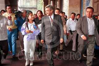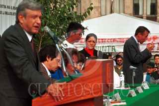 El jefe de gobierno, Andrés Manuel López Obrador, al término de la ceremonia donde entregó dos mil becas a personas con discapacidad, en el Zócalo . FOTO: Susana Navarrete/CUARTOSCURO.COM