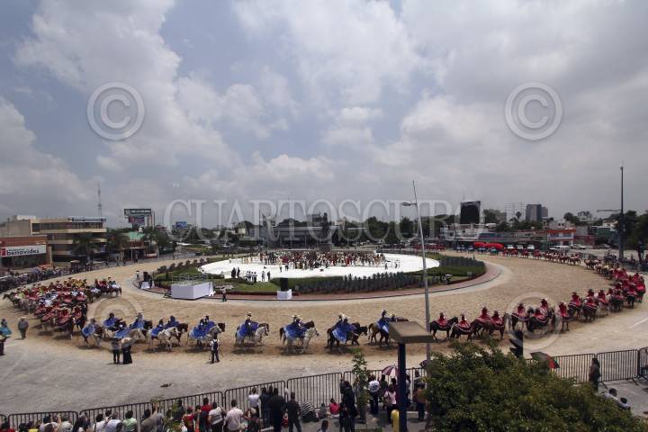 GUADALAJARA, JALISCO 08SEPTIEMBRE2012.- Este medio día en esta ciudad se implanto el Récord Guinness de mayor concentración de Escaramuzas a caballo de diversos grupos, en donde durante un lapso de 12 minutos hicieron suertes charras alrededor de la Glorieta la Minerva, con esto es la primera vez que se implanta el Récord Guinness en esta especialidad y para entregar la certificación estuvo presente la adjudicadora oficial Johanna Hessling. FOTO: FERNANDO CARRANZA GARCÍA /CUARTOSCURO.COM